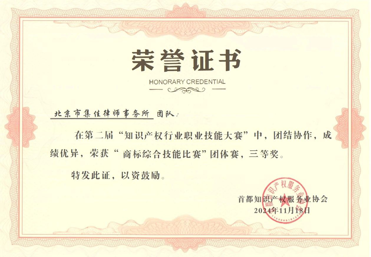 近日,在北京市知识产权局、海淀区市场监督管理局(区知识产权局)的指导下,由首都知识产权服务业协会主办,中国知识产权研究会专利专业委员会、北京(中关村)国际知识产权服务大厅承办的第二届“知识产权行业职业技能大赛”圆满落幕,集佳多位代理人与商标参赛团队在本届大赛中斩获多项佳绩。在“行业英语演讲比赛”个人赛中,何冉冉力战群雄,拔得头筹荣获一等奖,王茸茸、王瑜荣获三等奖;在商标综合技能比赛中,集佳参赛的两支队伍均取得优异成绩,由黎琳、赵敏敏、张雅静三位组成的队伍获得二等奖,由李晴、伍君、曾珍三位组成的队伍获得三等奖。